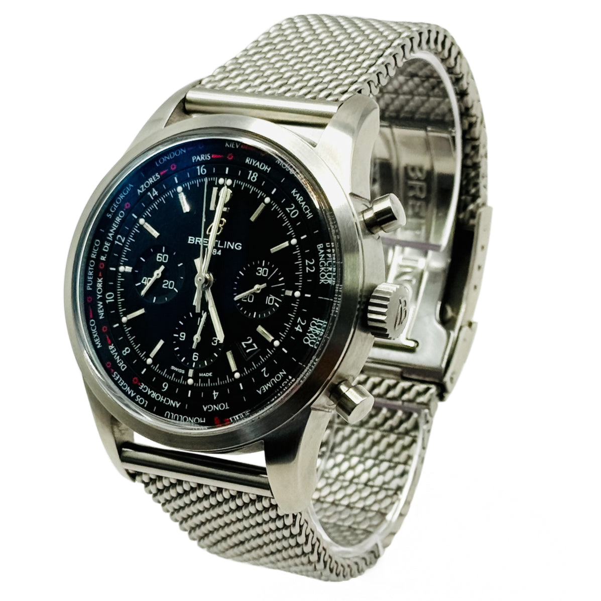 Powered by the in-house Breitling Caliber B05 automatic movement, the Unitime Pilot offers chronograph functionality, world-time indication, and COSC-certified precision. With its substantial wrist presence, technical capabilities, and refined Transocean styling, this model is an ideal choice for frequent travelers and Breitling enthusiasts looking for a statement piece with serious functionality.