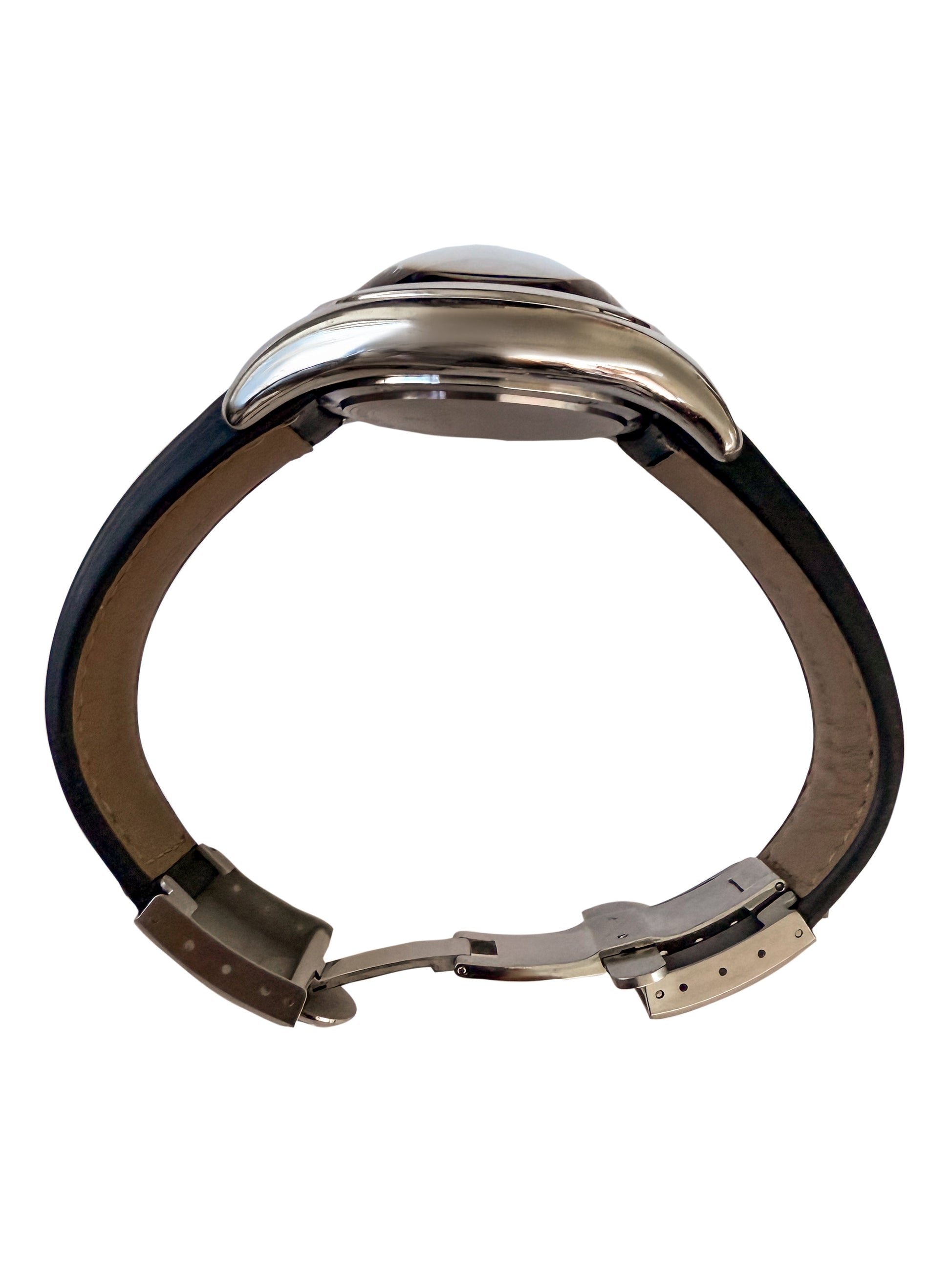 The Corum Bubble Reference 163.150.20 is one of the most recognizable and unconventional designs in modern watchmaking. This Circa 2000s example features a bold 44 mm stainless steel case and the Bubble collection’s signature ultra domed crystal, which creates a dramatic magnification effect over the vivid blue dial.
